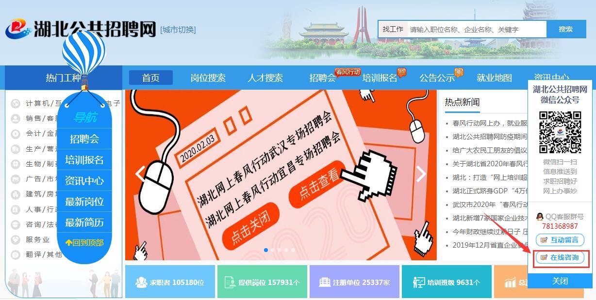 ①点击湖北公共招聘网(www.hbggzp.cn)网站首页右侧的“在线咨询”按钮。
