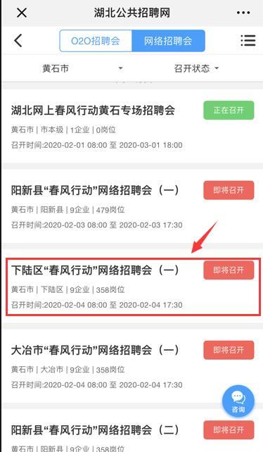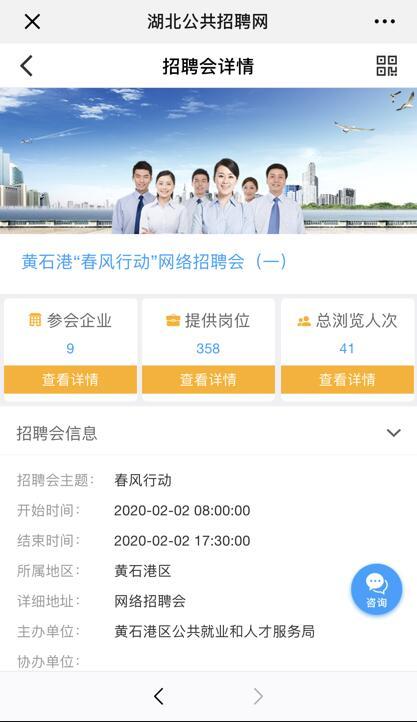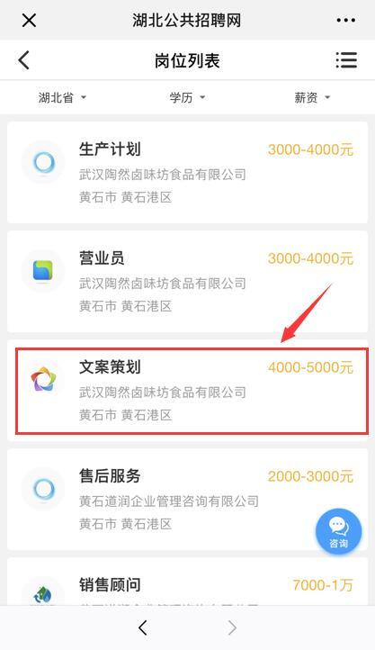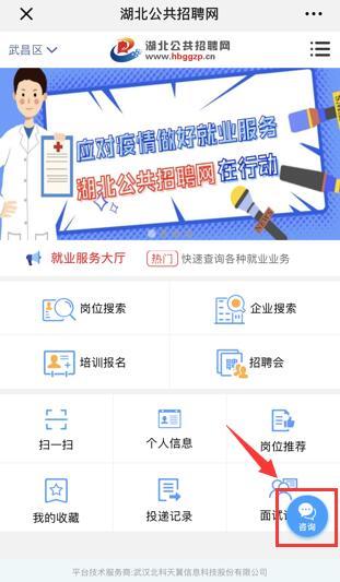 ③关注“湖北公共招聘”微信公众号,点击右下方“咨询”按钮。
