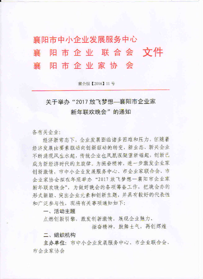襄阳市中小企业服务平台 - 关于举办“2017放飞梦想—襄阳市企业家 新年联欢晚会”的通知