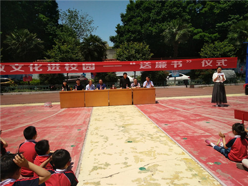 5月12日,樊城区科技局联合市规划设计院等辖区单位与中原街道陈营社区到前进路小学参加廉政文化“进校园送廉书”活动启动仪式,赠送廉政图书200多册。活动现场,少先队员们为参加活动的领导同志系上了鲜艳的红领巾,还为全校一千多名师生带来了精彩的廉政小故事和诗词朗诵表演,从而使读书学廉、读书思廉、读书践廉“扎根”师生心中。