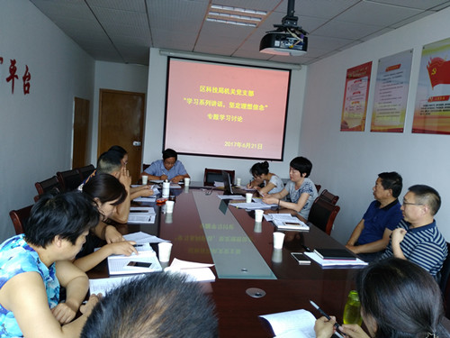 2017年6月21日上午,区科技局机关支部围绕 “学习系列讲话、坚定理想信念”开展专题学习讨论。会上首先学习了1966年2月7日《人民日报》刊发的《县委书记的榜样—焦裕禄》以及1990年7月16日刊登的习近平同志填词《念奴娇追思焦裕禄》,党组书记施红军、局长张俊彦先后传达了区委中心组、区委常委扩大会、全省知识产权工作大会、全市科技奖励大会等有关会议精神。随后全体机关干部围绕主题,人人发言,互相交流心得体会,大家纷纷表示要深入学习习近平系列讲话,不断坚定理想信念,立足岗位职责,认真履职尽责,确保各项工作双过半,推动科技工作再上新台阶。